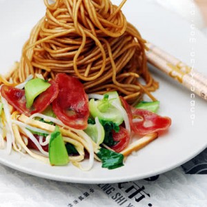 炒锅内重新热油,六成热时,放入面条,调入酱油使其上色,调入适量糖