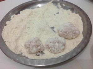 放入烤箱烤~或者放在锅里炸~过程都忘了照~抱歉。烤就十五分钟就可以咯,炸大概十分钟吧。