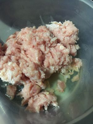 把鸡腿肉去骨头搅拌成肉沫,放入三个鸡蛋清~然后混合