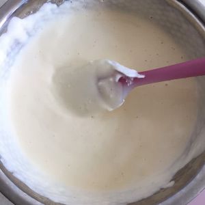 把打发好的蛋清分三次加入,⚠这里搅拌是上下左右呈一字线搅拌,不要打圈搅拌(据说打圈搅拌会灭气泡,发不起来,我没有进行过变量试验也不确定,但还是保险起见)