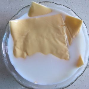 30克白糖,200毫升纯奶,四片芝士片混合,隔水在锅里化开,暂称为A(注:先放牛奶和白糖并搅拌至白糖差不多都溶解,因为如果芝士片一起放的话,白糖不方便搅拌融化。放入芝士片后用筷子将其戳破变成一小块一下块的,时不时用筷子搅拌加速芝士片融化。芝士片不需要化完全融化,大约变成芝麻粒的大小就差不多啦,因为之后的步骤可以使其变的更小的。)