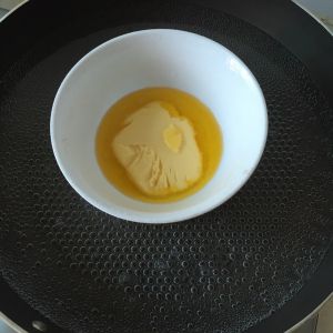 50克黄油隔水放锅里融化后,放置一边待用(图上的是刚开始融化,要等到全部变成液体)。