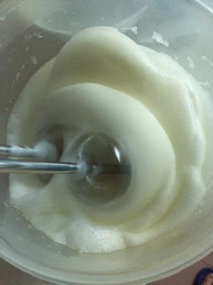 用打蛋器把蛋清打发(分三到四次把50克白糖加入,打发均匀),等到容器倒置时,蛋清不会流下来即可,不放心的可以打久一会。
