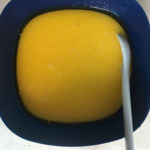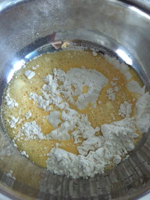 把溶解的黄油和稍微搅拌过后的蛋黄倒入A里,用筷子搅拌,暂称为B,会发现黄油浮在最上面,没关系,放着待用。