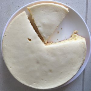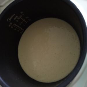电饭煲底部四周刷上油,预热一分钟左右(可以用之前碗里没到干净的黄油也可以用家里的油,没所谓)然后倒入搅拌好的液体。按上煮饭键,大约25~30分钟(我没有拿毛巾堵出气孔),跳了就好了。取出前也可以插根牙签看看蛋糕中间有没有熟。