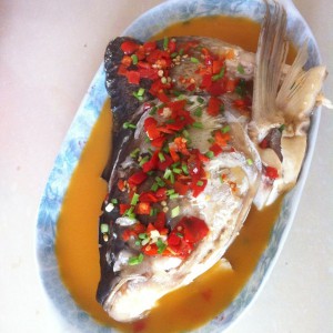 热锅放油(油不用太多),油热了放姜煎一下,下鱼头(正面鱼嘴方向先下去,煎一分钟左右翻面)反面煎两三分钟(注意这时油会贱的比较厉害火可以调小火),然后倒入黄酒继续煎(这时要开大火就是去腥),大概煎一分钟左右倒入一小碗水,加剁椒酱(我们不太能吃辣,我放了两勺左右,喜欢辣的可以多加)加入小半勺糖盖锅煮。