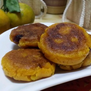 南瓜蒸熟捣烂与糯米粉揉成团!