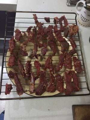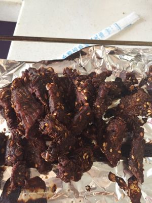 我家烤箱最大250度,我喜欢干巴一点的,把烤箱调250度,直接把肉放里烤10分,然后拿出来翻面再考8分!我把烤箱上下烤灯都打开,烤时候铺了一层锡纸,这是出锅后的样子!味道还是满不错的