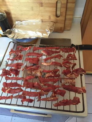 把肉每条都要摊开,自然风干,这步很关键,一定要风干12小时,最好中途把肉翻一下,让两面都能风干到.