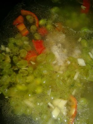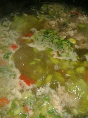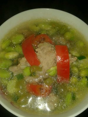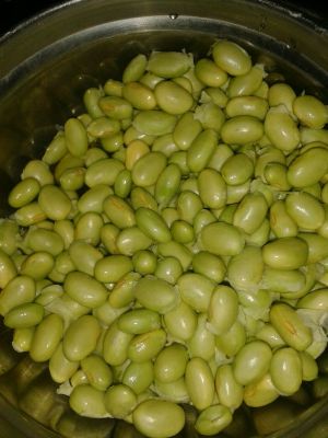热锅倒油烧热,放入蒜爆香,放入毛豆和红椒翻炒片刻,加入盐继续炒至毛豆表皮脱落。