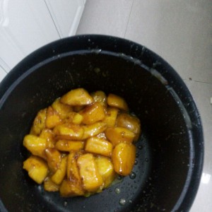 熬趟,我用的是水熬的,用油的话比较容易糊,待气泡从大到小,有糖焦色便可将扎好的地瓜放入