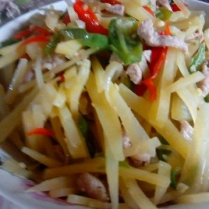辣椒肉熟之后放土豆丝,翻炒几分钟之后放醋和盐。