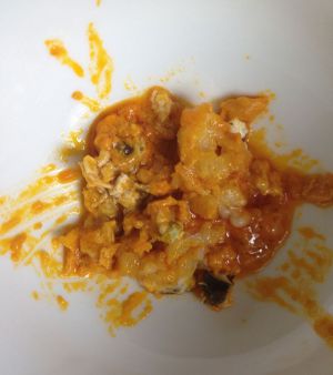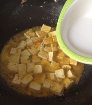 倒入蟹黄,生抽和少许开水,转大火,左右晃动锅,让豆腐均匀裹上蟹黄。