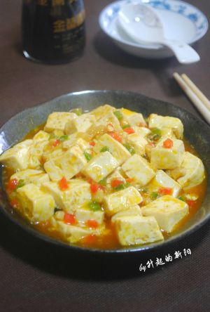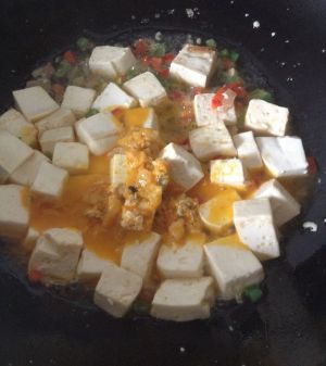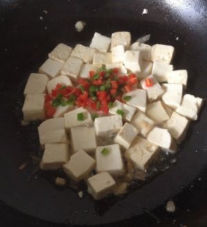 用小火煎一会儿豆腐,倒入切好的青红椒粒。