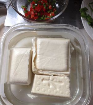 豆腐(介于老豆腐和内豆腐之间的)放在盐水里泡一下,青红椒切细粒。