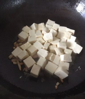 起油锅,葱姜蒜炒香,下切好小块的豆腐。