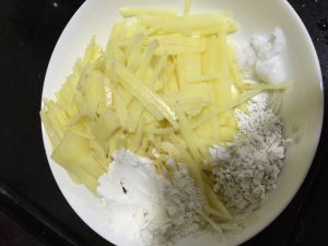 一个土豆切成丝,放一汤勺面粉,一汤勺番薯粉适量盐