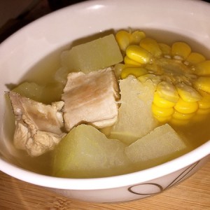 四十分钟后把冬瓜玉米放进锅内。继续小火煮20分钟。