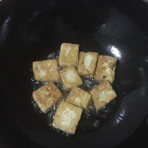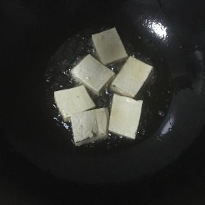 豆腐过油。锅洗净,锅热之后再倒油,油热之后下豆腐