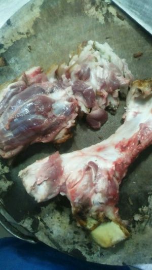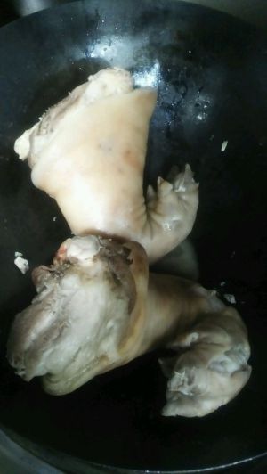 油锅烧至7-8成热,放入猪脚炸,直到皮变硬为止。(用锅铲敲会感觉得出来的)