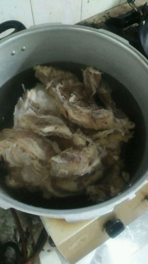 将洗净的猪脚放入压力锅,放水淹过猪脚,加老姜,料酒压制15分钟。