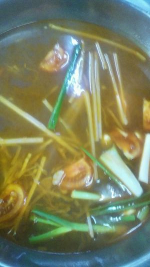 火锅盆内放入油烧热,下老姜、草果、八角、花椒、干辣椒炒香,加清水、酸汤、盐、味精、鸡精、料酒调好味,烧开上桌。