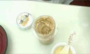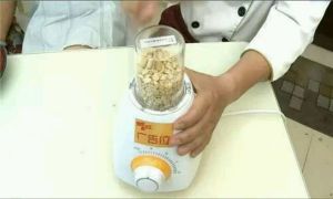 花生被打成小颗粒后,停下来加入一些热花生油再搅拌,花生油和花生的比例最好是1:2。注意,花生油一定要加热过,否则会影响花生酱的味道!