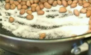 首先我们要把花生炒干,我们在锅里面放入盐,没过锅底就可以。