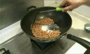 然后把花生下锅炒。这样花生不会直接接触到锅底,所以不用放油也不会炒糊!