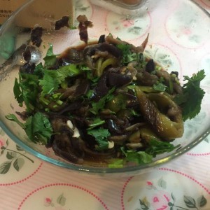 把茄子和辣椒都撕成丝,加煎辣椒的油,糖醋和酱油还有盐,香菜,拌均匀,有时间的话可以冰一会会