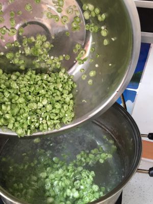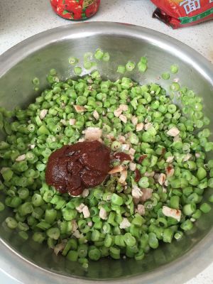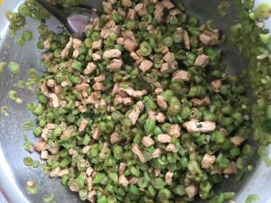 芸豆切丁倒入开水锅,绰熟,然后捞出倒入肉盆,放冰箱备凉