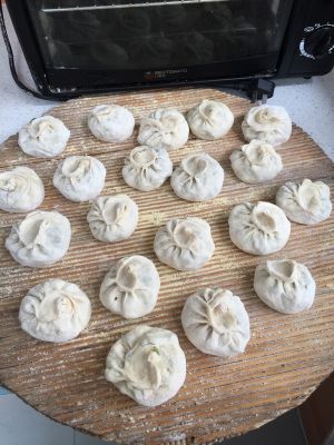 包成小包子,后来我发现这样的不如饺子那样的易熟,还是建议大家包成饺子那样,这样的要两面都煎才行,否则上面的褶子太难熟