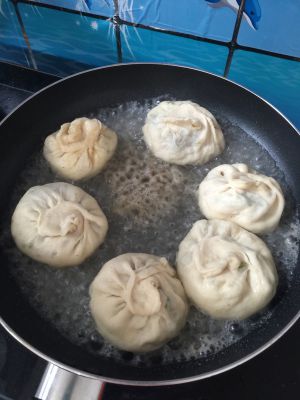 加油,把包子放进去,待煎黄,再加水,盖盖子把水烧干,我是第一次包,很难看,但是很好吃