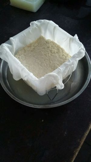 将豆腐脑用勺子舀入预先铺好豆腐布的豆腐盒盖内。