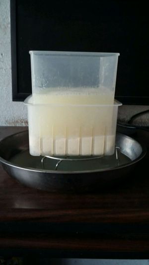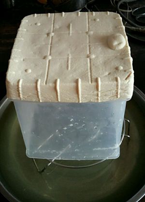 把豆腐布四角折叠,盖在豆腐脑上,将豆腐盒盛装一半水,压在豆腐布上。