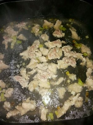 水烧开之后,先把火关了让水不再沸腾(不然煮出来的汤很混浊)再用筷子把肉片一片一片夹下锅,全部放好肉开火加盖两分钟煮沸
