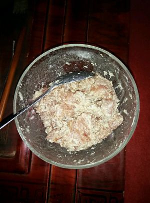 肉切好,把地瓜粉放到肉里面手带一次性手套把肉抓均匀