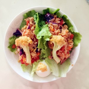 少许油,将肉、蛋、菜等材料都一起爆炒一下,加入米饭