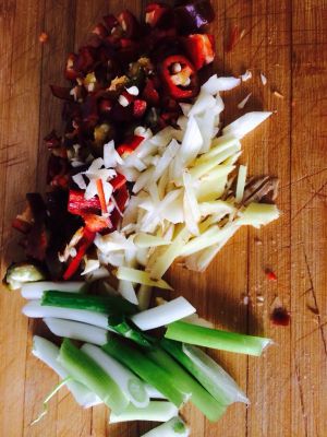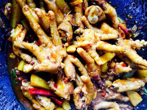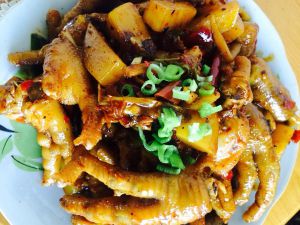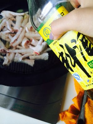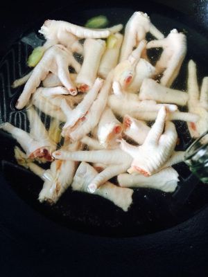 鸡脚捞起备用 油涨放所有配料 !豆瓣酱忘上图!一起放入