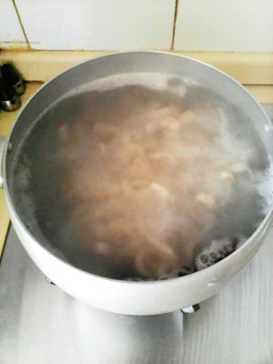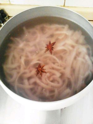 加水。水,肉皮,2:1的比例。放入八角,两小勺盐,大火煮