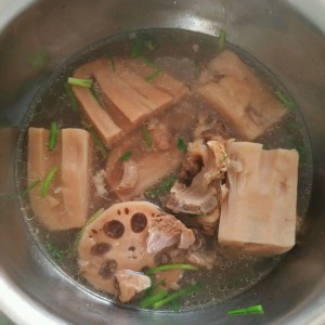 大火煮20分钟,再小火炖30~45分钟,视切大小而定。好了,放点花生油,葱花,盐即可。盐要够味,汤才甜(广东人喝汤甜,不是糖那种甜,就是好喝,汤不够味是难喝。)肉和骨头已碎,吃的就是藕和汤。