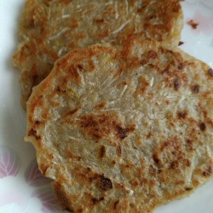 锅热后放少许底油,放入一勺面糊,摊平,两面煎黄后出锅即可。