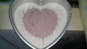 第六步:把慕斯溶液倒入模具中,留一小部分放入果酱调色,可自行装饰