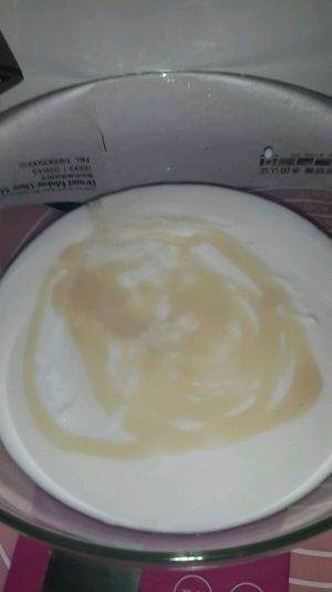 第五步:在酸奶中加入炼乳 ,吉士丁粉,然后加热使吉士丁粉融化