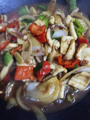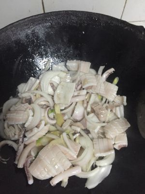 所有调料已经放齐了,然后就这样翻炒吧!炒到洋葱熟了鱿鱼就熟了。然后大火收汁,调入1勺芡粉!