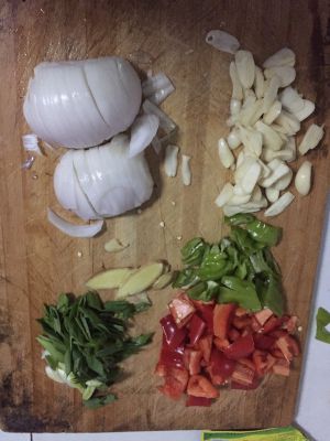 然后切配料啦啦啦啦啦~姜和蒜子切片,青红辣椒切大块,洋葱随便切~葱切段~