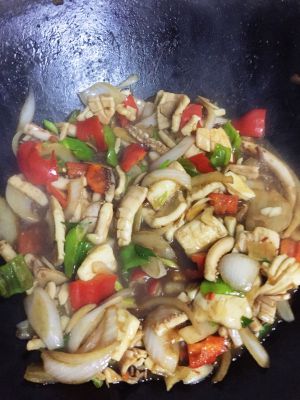 热锅烧油至8成热,下姜蒜炒香,下鱿鱼和洋葱炒5成熟,放2勺料酒,酱油醋各1勺,豆瓣酱2勺,蚝油1勺翻炒全部上色,因为豆瓣酱很咸,此时可以尝一下汤汁如果味道不够可以适量调入盐提味~