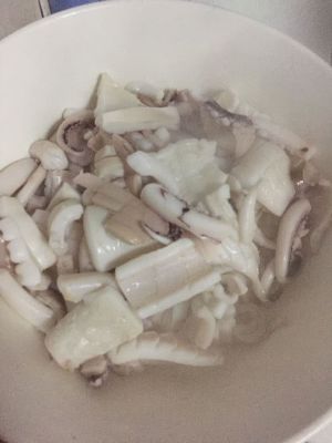 完蛋了,少拍一张焯水的图片,就这个刚入锅的代替一下吧!锅里烧开水放2勺料酒后将鱿鱼放开水里焯一下,打卷儿就捞起来装盘备用了~