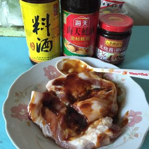 开始调味,酱油两调羹,蚝油两调羹,叉烧酱三调羹,料酒一调羹,不需要加盐或加少许盐。
