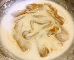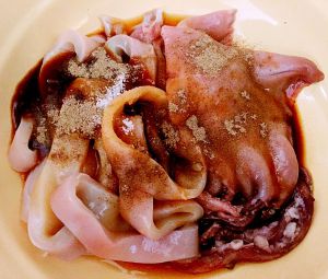 切好的鱿鱼放入糖、一品鲜酱油、料酒、黑胡椒粉腌制入味(时间越久越入味)